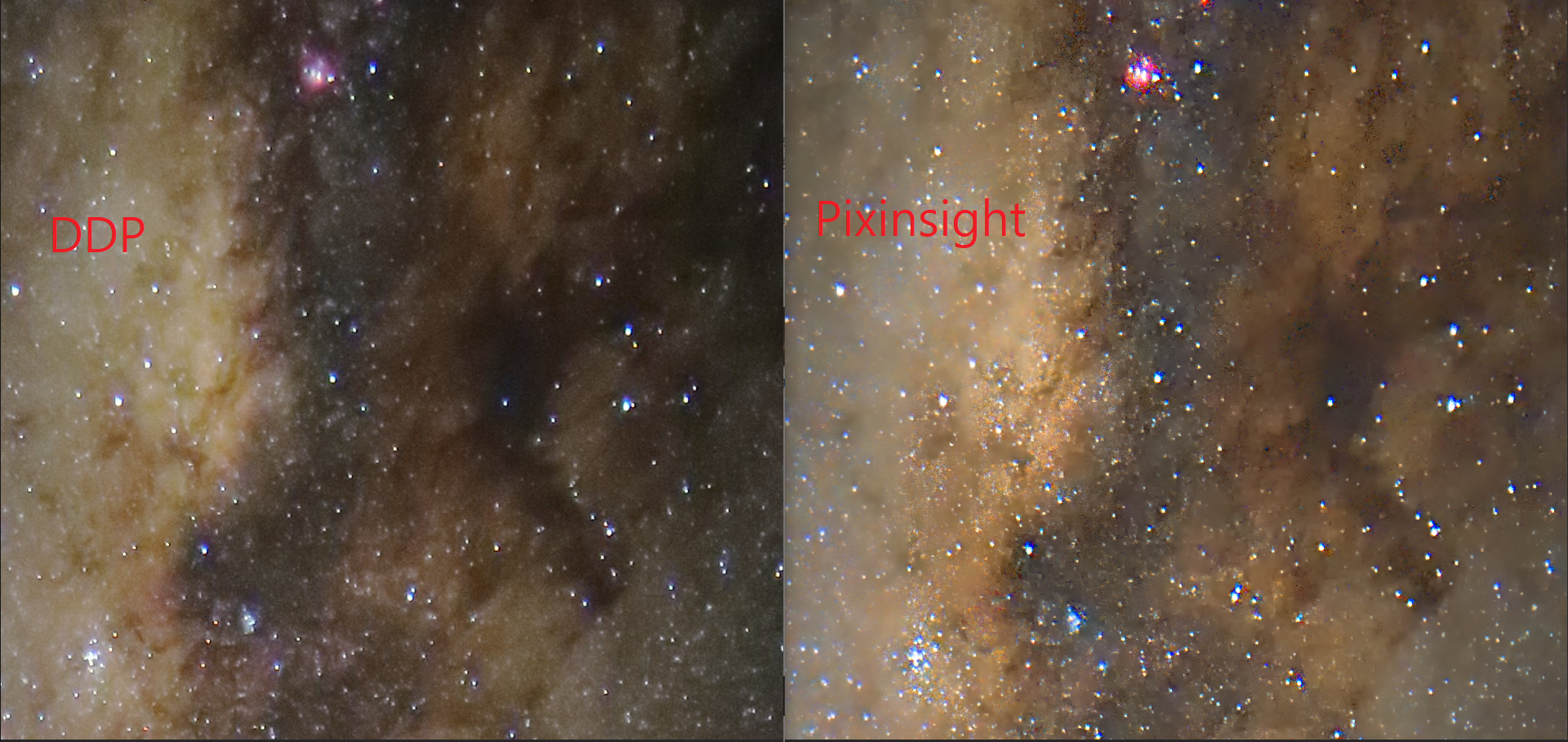 - DPP: 눈으로 본 것과 비슷하다. 은하수와 암흑대가 선명하게 대비된다.