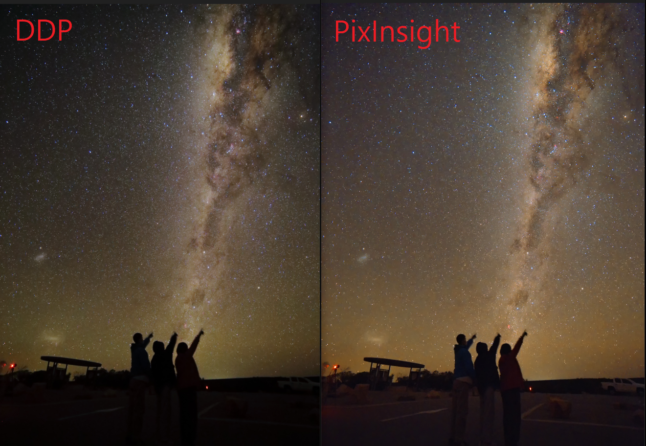 - PixInsight: 더 밝다. 첫 눈에 보기에 좋다. 배경도 암흑대도 밝아진다. 별도 훨 더 밝아지고 많이 보인다.